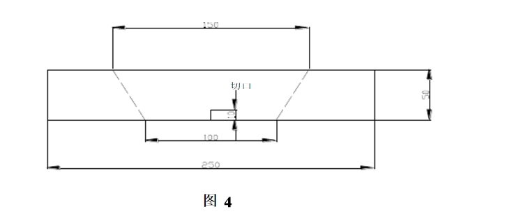 ③.梯形長(zhǎng)邊為150mm、短邊為100mm。在短邊正中處剪一個(gè)垂直于短邊10mm、長(zhǎng)的切口。試樣在拉伸強(qiáng)力儀上兩夾具間距離為100mm。夾頭沿圖3虛線。